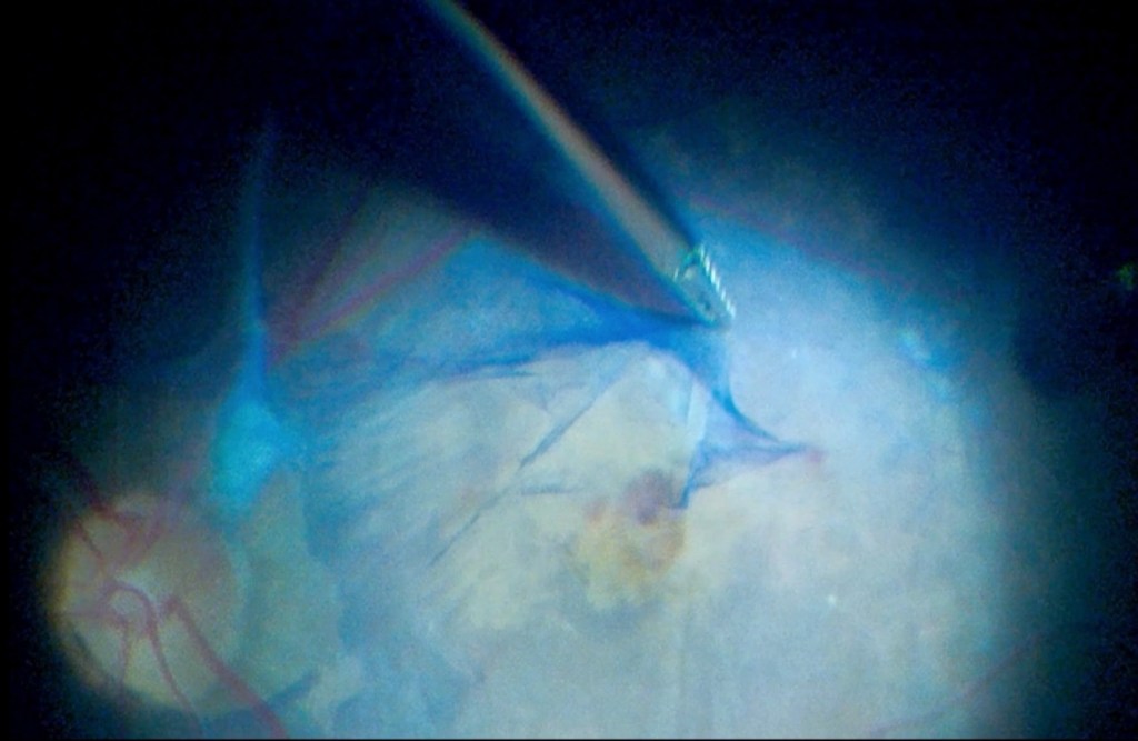 La procédure a débuté par l’extraction de la cataracte, suivie d’une vitrectomie standard par pars plana, réalisée à travers trois orifices avec un calibre de 23. Une prolifération fibrovasculaire dense a été observée au niveau de la zone maculaire. Une pince crantée de calibre 25 a été utilisée pour engager et soulever le tissu fibreux, qui a été pelé en bloc. Deux échanges air-fluide ont été effectués au cours de l’intervention.
